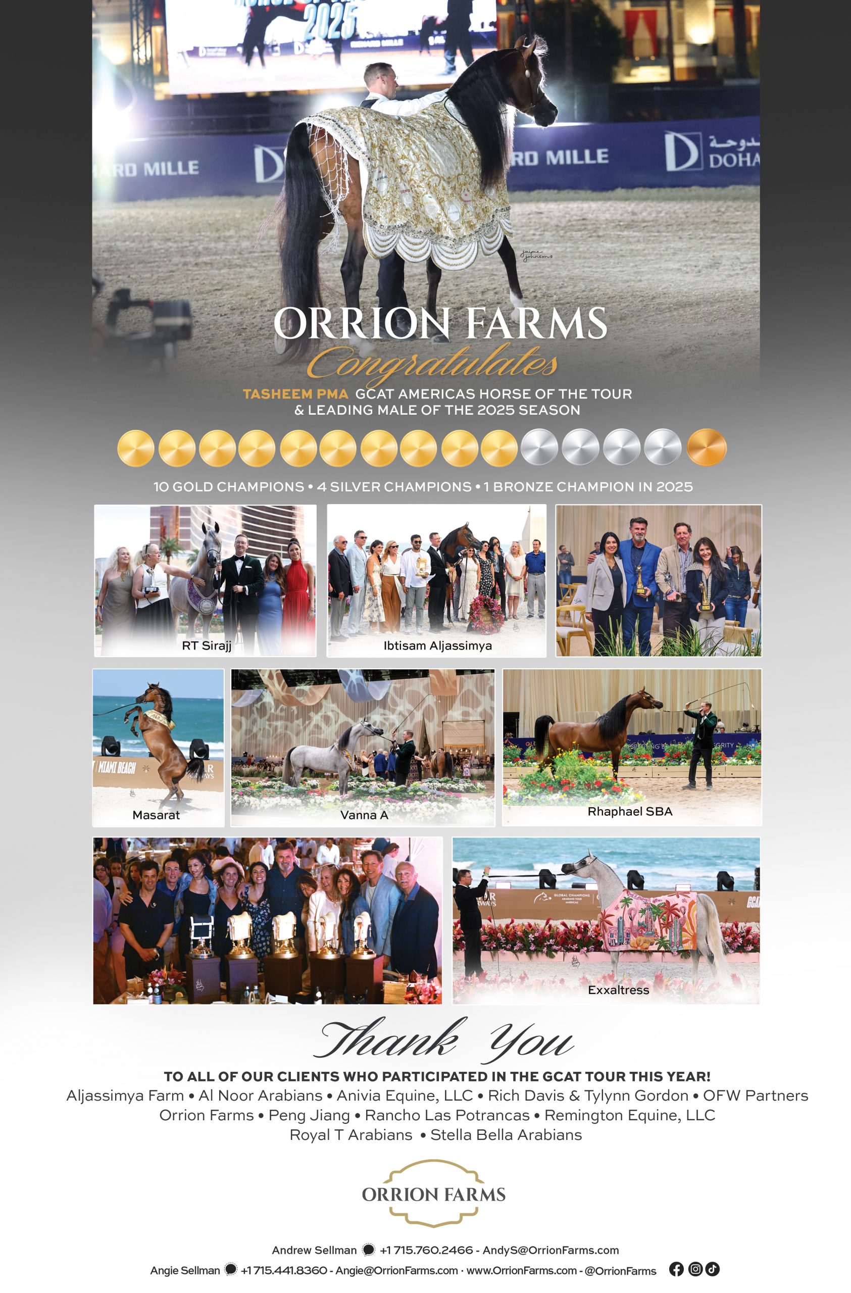 Orrion Farms uniquely claims a long, cherished heritage with the Arabian horse, and we walk forward in humble confidence because of that foundation from which we make every decision. Mares are the cornerstone to any successful breeding program, and Orrion Farms is no different. Each mare plays her own vital role. Our breeding program seeks to honor the pillars of our past (such as our daughters of the great Amety B) as well as blaze new horizons for the future, like the glorious Exxaltress. In turn, the mares are bred to the finest stallions available in the world, offering a truly global Arabian horse showcase.